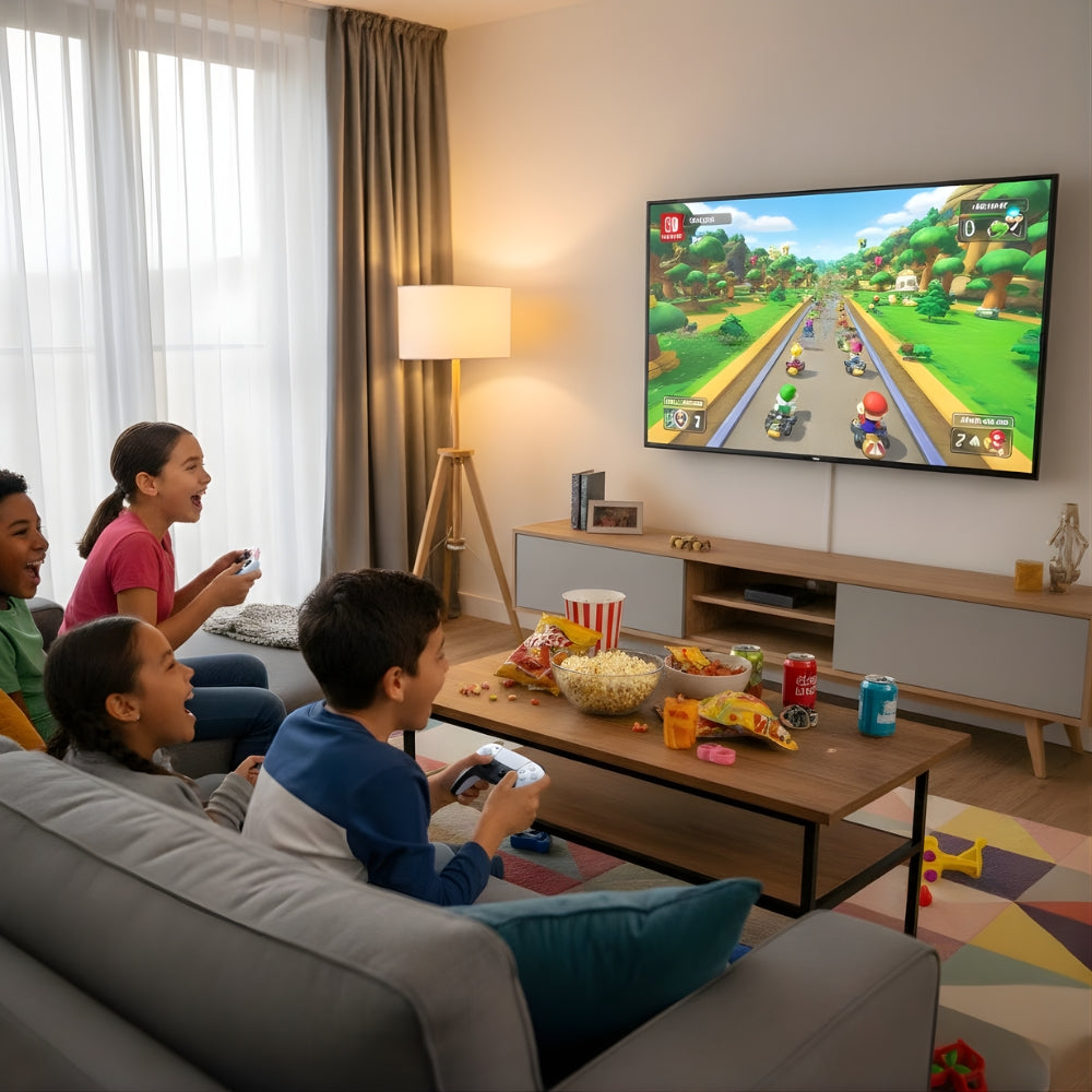 Just plug the console via HDMI cable (included) and select the HDMI source — no setup needed.